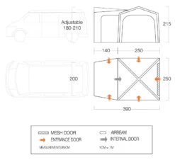 The small pack size enables it to be carried in any vehicle as it can be stored underneath seats. The Vango Cove II Air is now available in two attachment heights: a Low (180 – 210cm), which is perfect for Transporter T5’s and similarly sized vehicles, and a Mid (215 – 255cm) which is designed for larger panel vans, campervans, and small motorhomes. Crystal clear windows offer plenty of light and toggle-up curtains help to give privacy when it is needed. The open front canopy offers protection against the elements which is ideal in uncertain weather conditions.